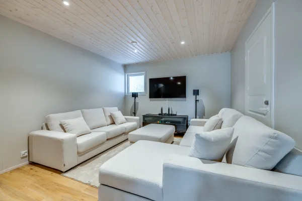 Molemmissa villoissa on kaksi oleskelutilaa, yksi kummassakin kerroksessa. Kuva Villa Helmen alakerrasta.