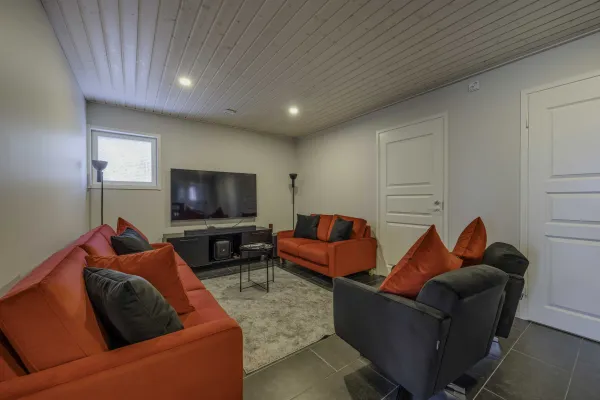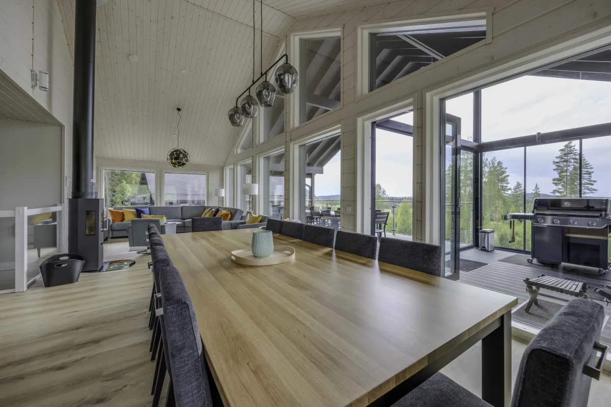 Lomailu on tietysti yhdessäolon ja -ruokailun aikaa, joka luonnistuu niin sisällä kuin suurella terassilla, joissa molemmissa kahdentoista hengen pöytäryhmät. Alakerrassa erikseen vielä jääkaappi juomille, pyykinpesukone, kuivausrumpu ja kuivauskaappi. Alakerrassa on kaksi wc:tä ja tyylikäs saunaosasto. Yläkerrassa on kylpyhuoneen ja wc:n yhdistelmä.